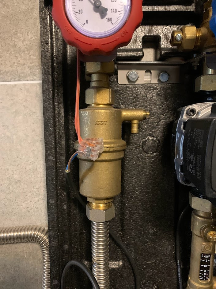 - Není to jen řemeslník k pohledání, ale i odborník přes elektro instalace. Prodloužení kabelu tepelného čidla kolektoru je spojeno wago spojkou a spokojeně si visí v krytu čerpadlové jednotky.