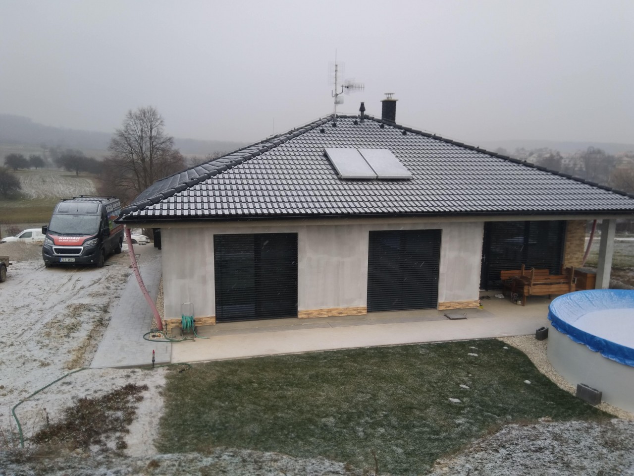 Instalace solárního ohřevu na novostavbě v Šakvicích z roku 2020. Instalaci jsme zvládli na 1 i přes nepřízeň počasí. Vidět to nejde, ale ten den zatraceně hodně pršelo. Glazurovaná pálená taška je ideální kluziště. Dům stavěla mladá rodina, pán sršel energií. Doufáme, že i přes COVIDové nepřízně se mají dobře a solární systém řádně slouží!