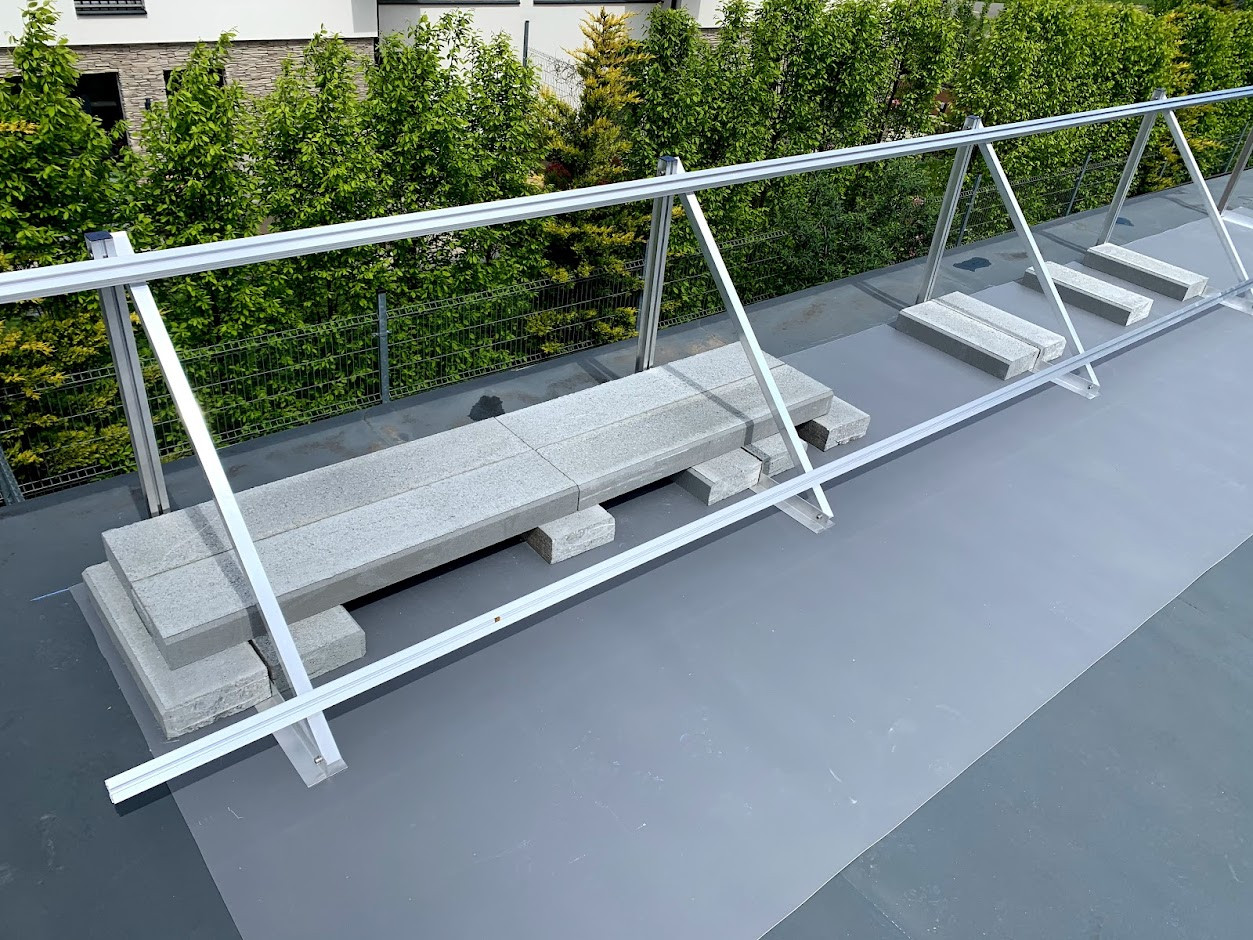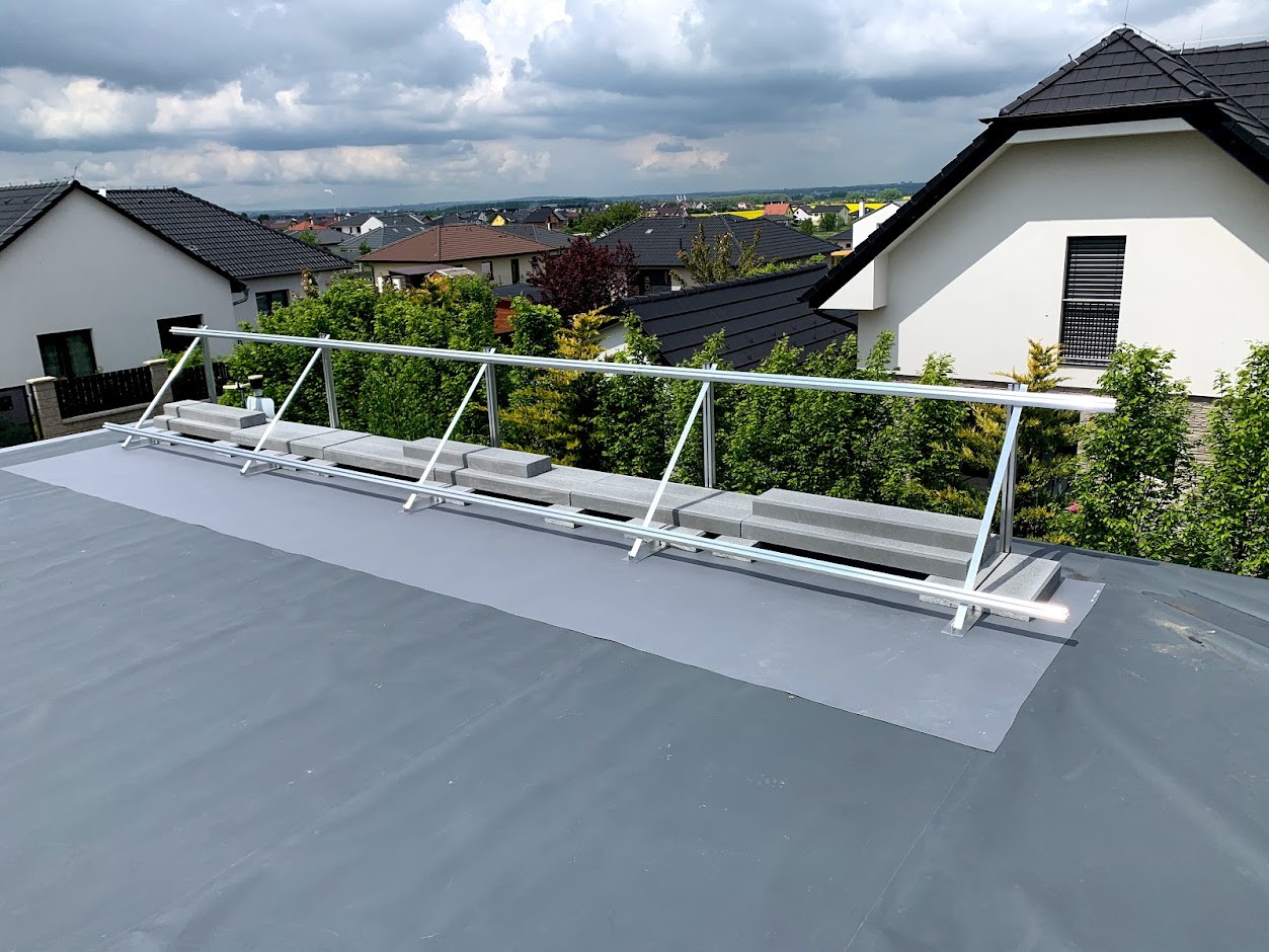 - Montáž jsme začali rozměřením konstrukce na ploché střeše domu. Smontovali jsme konstrukci a připravili gumové pásy pod betonové bloky, které slouží jako závaží, aby nám kolektory nevzal první vítr. Postupovalo se přesně podle návodu výrobce.