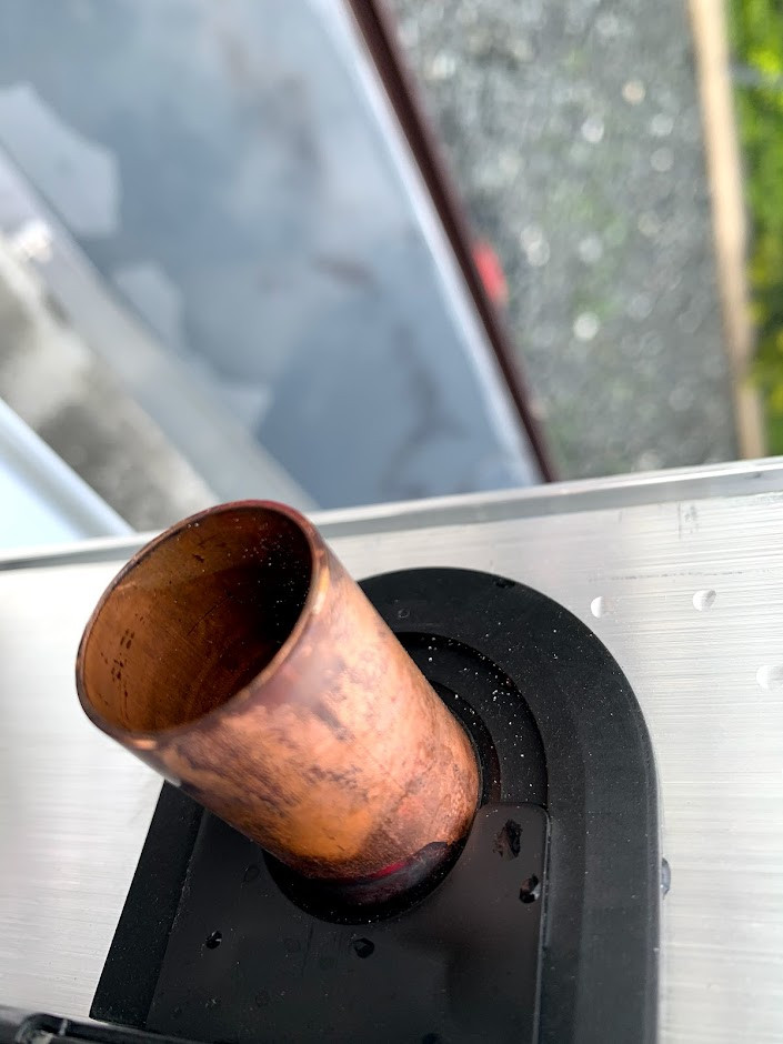 - Na posledním obrázku je vidět zakončení sběrače kolektoru uvnitř panelu. Běžněji se lze setkat s výstupy solárního kolektoru po jeho stranách, které se dodatečně zavíčkují svěrnou armaturou na Cu 22.