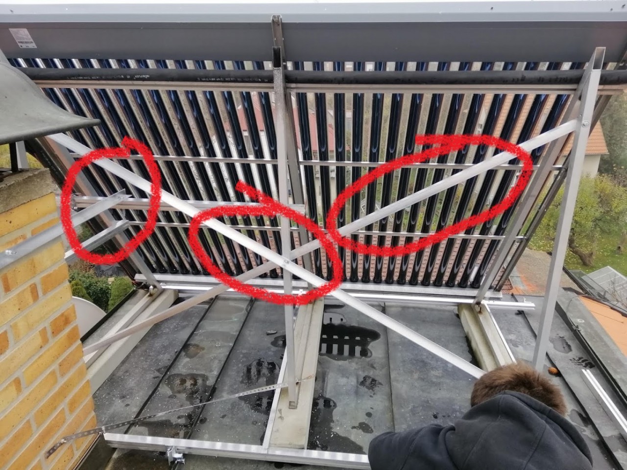 Dole na fotkách je původní zavětrování. Zpevnění konstrukce hliníkovými profily je vidět na zadní straně. Teď už se kolektory do strany nevyvrátí.