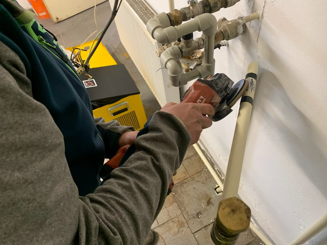 Pomocí nářadí REMS zamrazíme potrubí a uřízneme. Elektrickou závitnicí vyřežeme závity. Vše do 20 minut